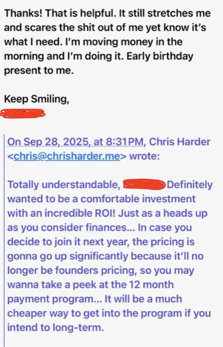 He has touched not only my heart but also has deeply influenced me and made a huge mark in the heart of my millennial children. When the time came for me to up-level my business, there was only one person who I was willing to do that with. That was Chris Harder.